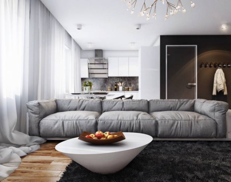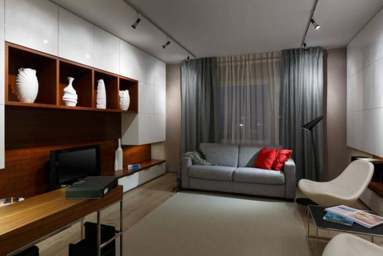 - الكثير من الفضاء. كل قطعة من الأثاث تؤدي وظيفتها ، وأحيانًا لا تقوم بها. لذلك ، على سبيل المثال ، تتحول أريكة مع نقرة من الرسغ إلى مكان نوم مريح ، وطاولة قهوة صغيرة إلى طاولة طعام كبيرة.