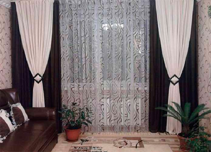 نموذج غير عادي من الستائر المزدوجة. مزيج من اللوحات المتناقضة وترتيبها الأصلي بالنسبة لبعضها البعض. تصميم ستارة جميلة لغرفة المعيشة.