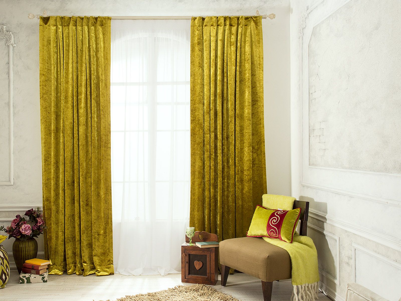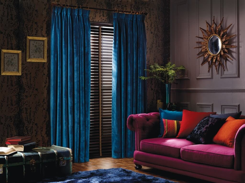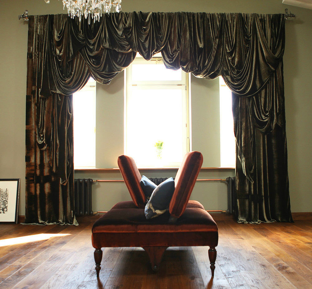 الستائر المخملية الضخمة المزينة بألوان زاهية من البناء المعقد ستكون مناسبة فقط في غرفة كبيرة مع ديكور مناسب.