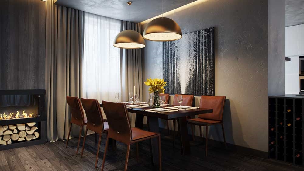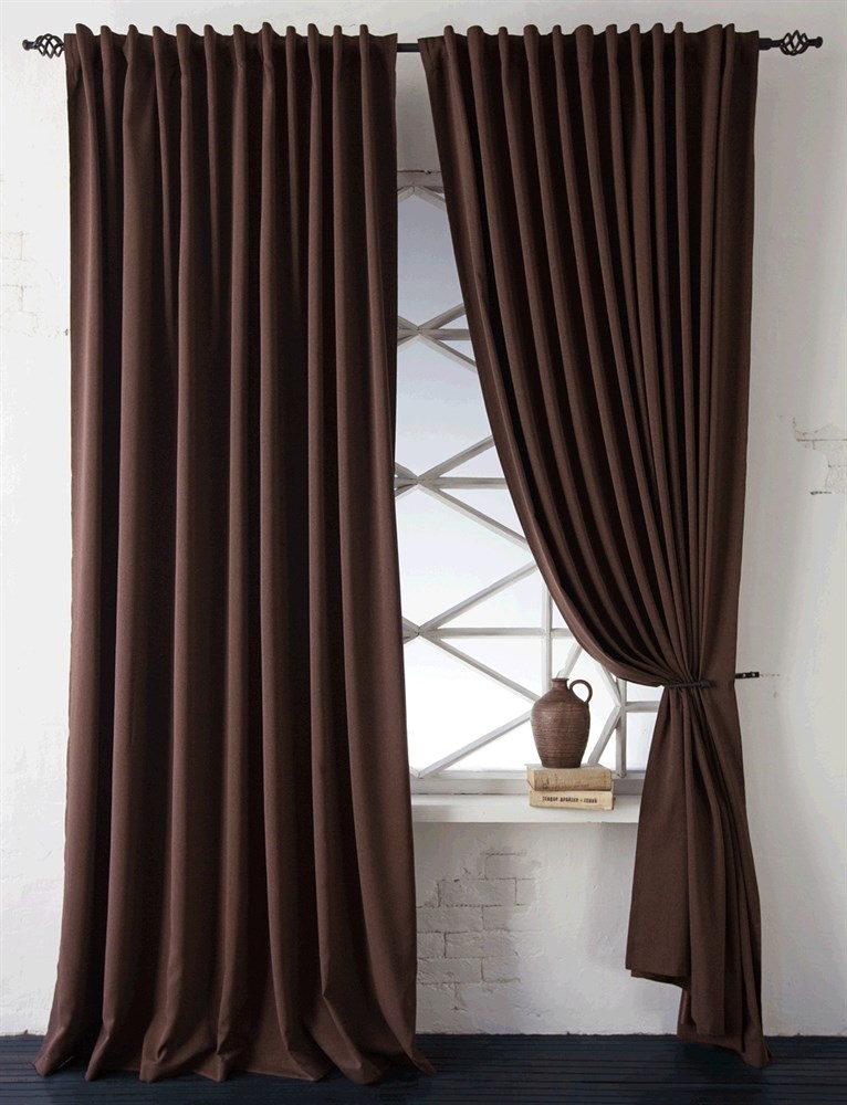 الستائر البنية الداكنة لا تبدو ثقيلة للغاية وكئيبة ، بفضل اللمسات المشرقة في الداخل: الكرسي ، الكرسي ، الوسادة. مزيج صحيح من العناصر البسيطة يعطي نتيجة مذهلة.