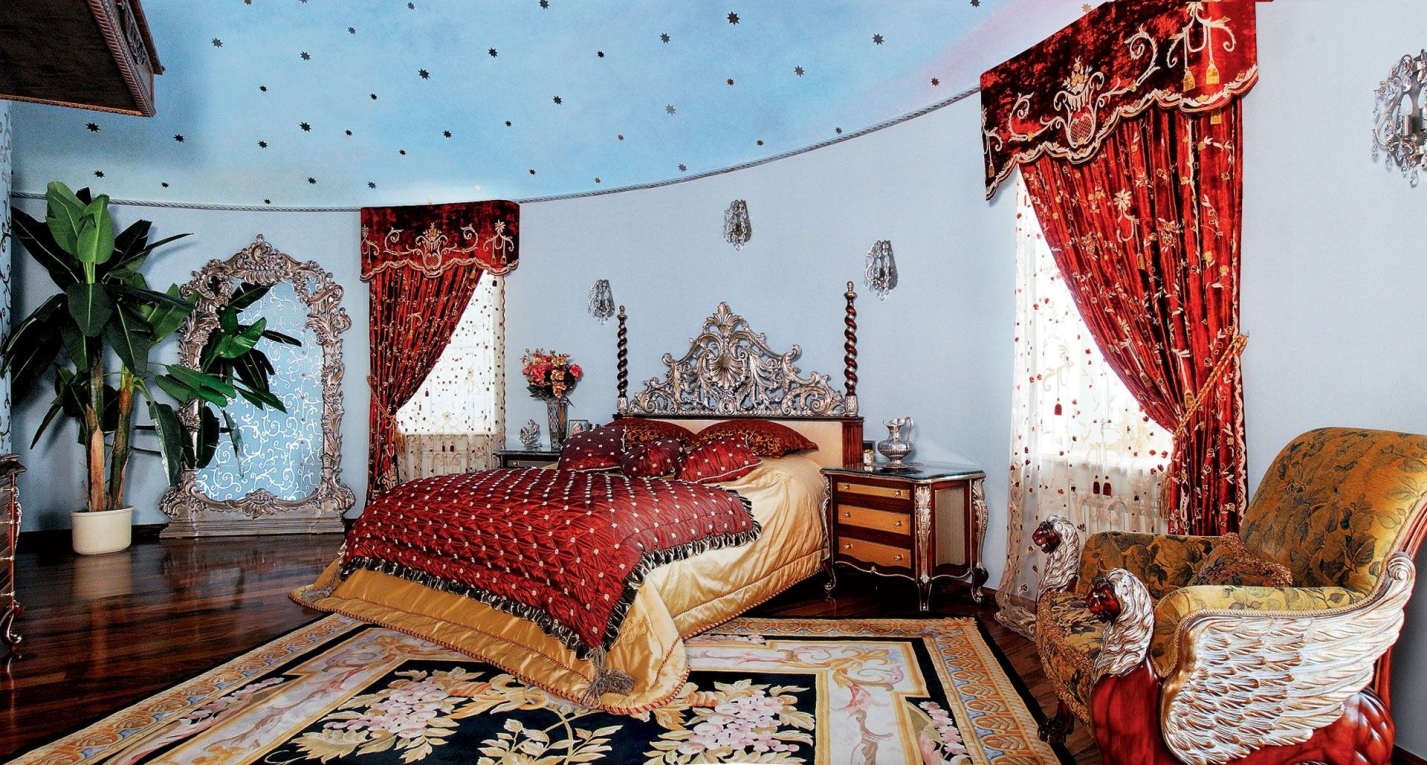 - النمط الشرقي دون المخمل الفاخرة لا تستطيع أن تفعل. الألوان الزاهية والكثير من التطريز الذهبي والإكسسوارات مناسبة هنا. الأثاث الذهبي وعناصر الديكور المزينة بنفس الأسلوب ستجعل الغرفة رائعة.