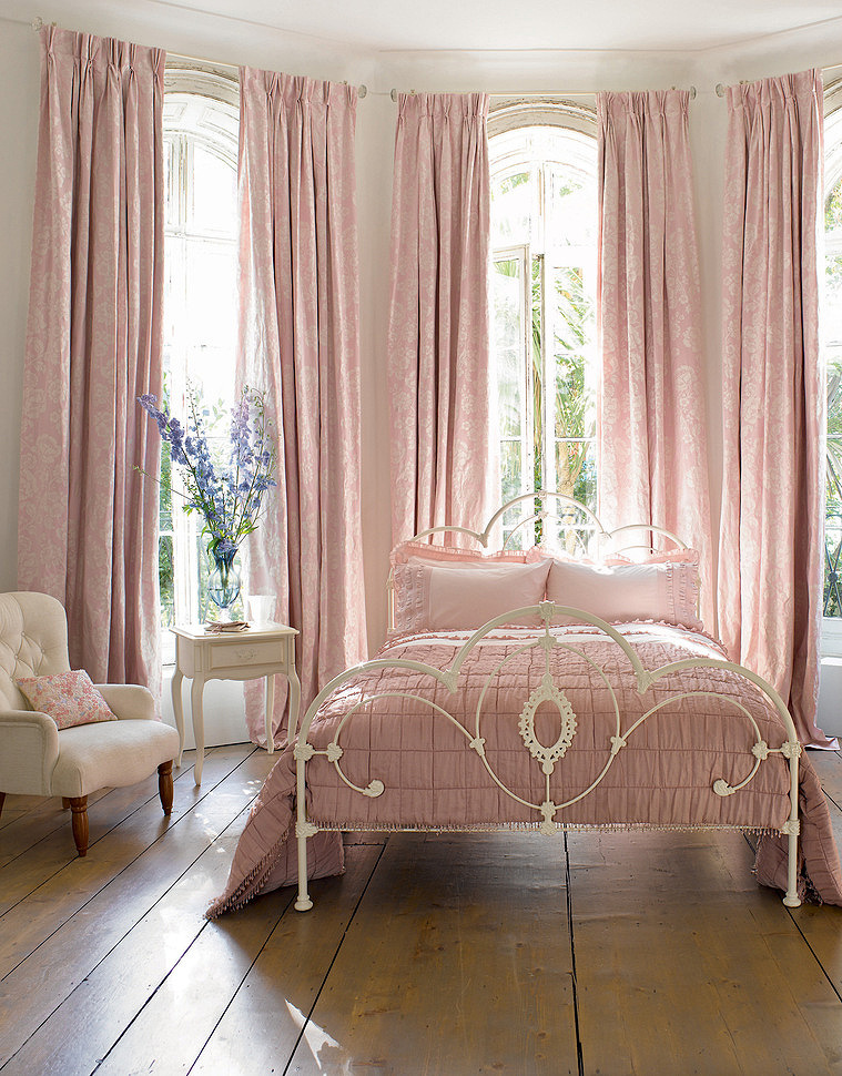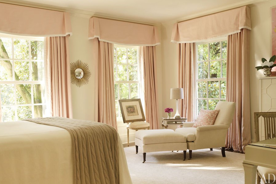 لغرفة النوم ينصح لاختيار ظلال القطيفة الخفيفة. والأفضل إذا كان الستار طويلاً على الأرض. في هذه الحالة ، سيكون من الممكن زيادة ارتفاع الغرفة بصريًا.