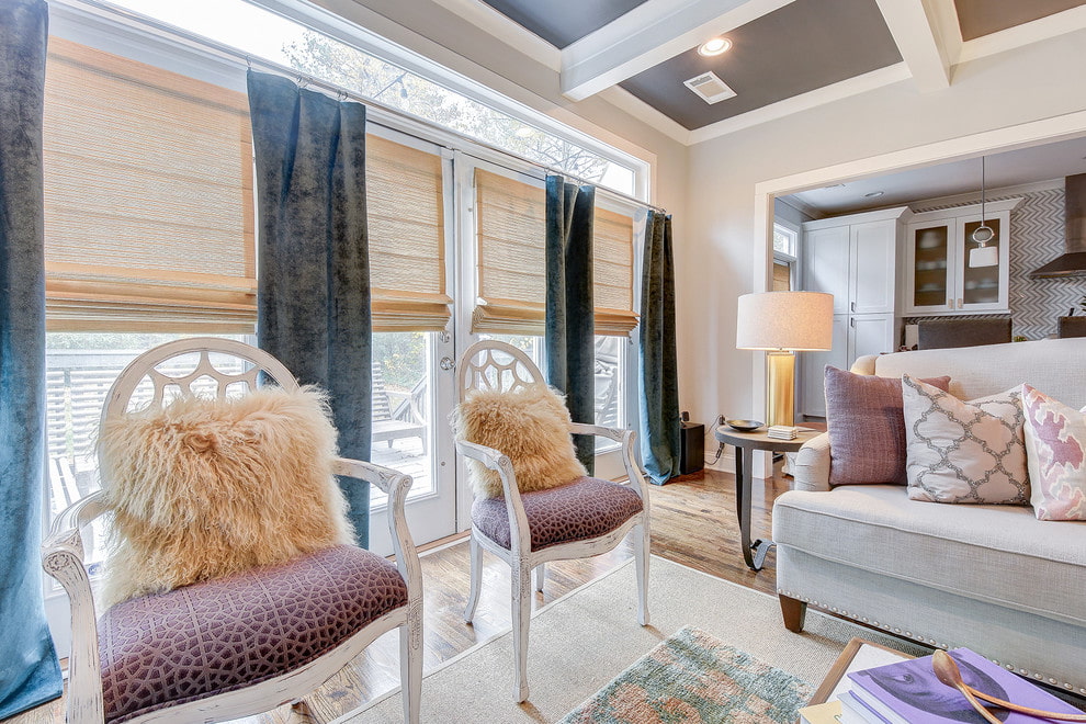 مزيج ناجح من الأقمشة القطيفة على نافذة غرفة المعيشة الحديثة
