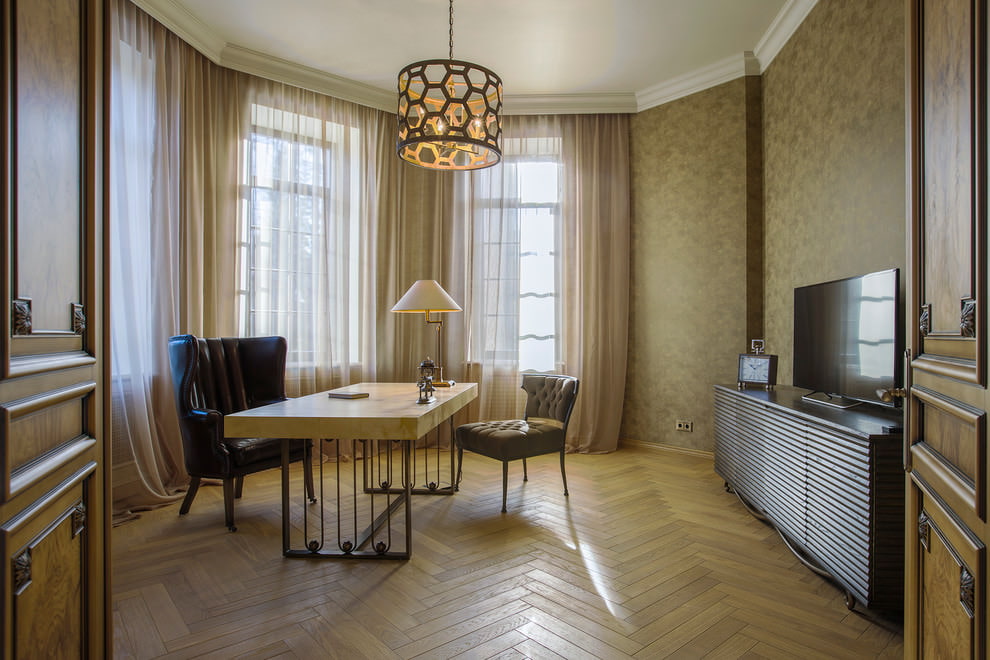 في غرفة معيشة صغيرة ، ستكون الستائر الخفيفة المصنوعة من القماش الناعم أو الستائر القطنية أكثر ملاءمة. إذا كانت الغرفة كبيرة ومشرقة ، يمكنك استخدامها في زخرفة نغمات هادئة ، مما يقلل بصريًا قليلاً.