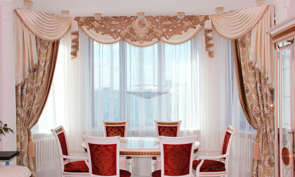 لإنشاء الأقمشة ، يمكنك تطبيق podhvaty ، بطريقة كلاسيكية ، لجمع الستائر من الجانبين على مستوى عتبة أو أسفل ، بشكل متماثل أو غير متماثل.
