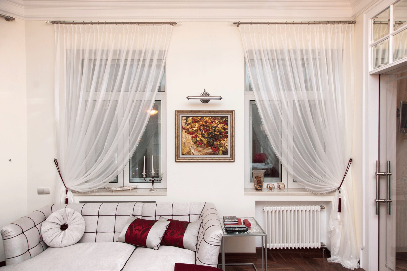 يتم اختيار تجهيزات الستائر اعتمادًا على طراز الطنف. على ملف التعريف ، الرغيف الفرنسي ، ويفضل أن يعلق بشريط خاص ، والسنانير. على بقية ، يرن مع مقاطع ، مقاطع. عند حساب طول التول ، من الضروري وضع مسافة بادئة حتى 1.5 سم من عتبة الأرضية أو النافذة.