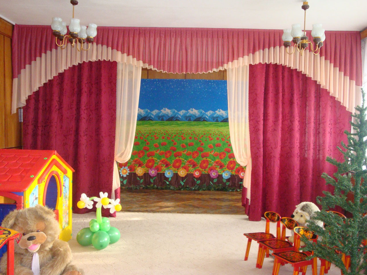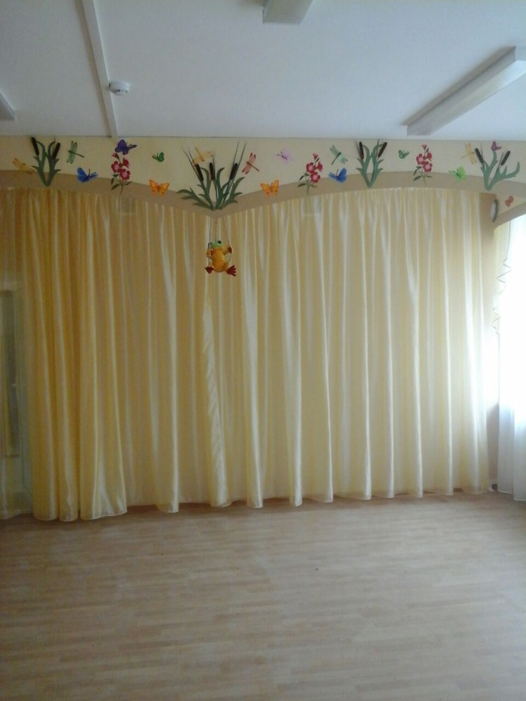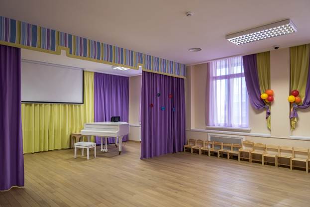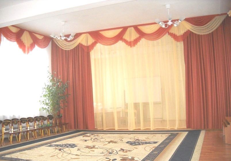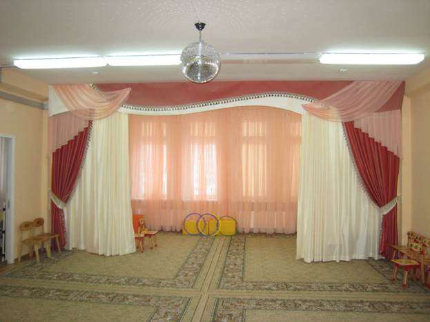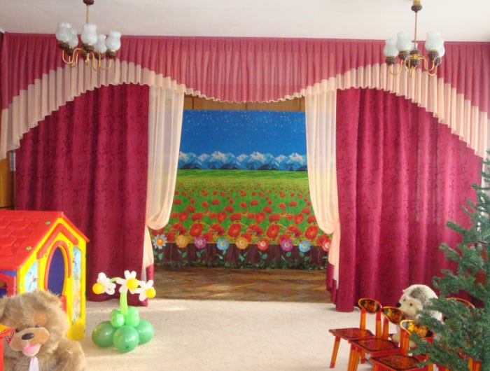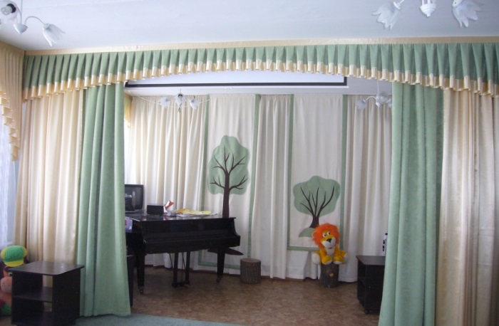 ستائر في غرفة الموسيقى - مكان لا يغني فيه الطفل الموسيقى ويتعلمها فحسب ، بل يحتفل أيضًا بالأحداث الرئيسية في حياته وعطلاته وأعياد الميلاد.