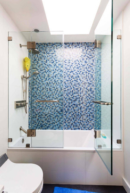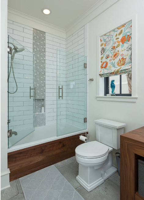 خيار بسيط هو باب شفاف. يمكنك تجربة خيارات النموذج الأصلي ، والتي ستمنح سحرًا خاصًا. يمكن تزيينه بالطلاء أو ملصقات مضادة للماء غير عادية. سيبدو بشكل متناغم في الحمامات الكبيرة ، وعلى طراز بساطتها.