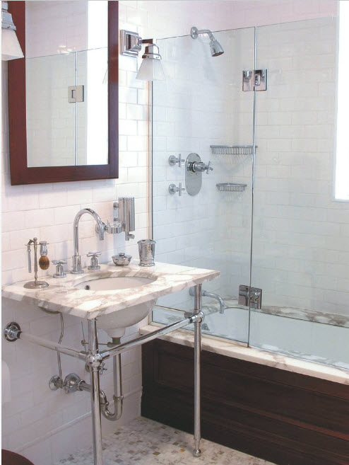 الشخصية المعدنية الأكثر استخداما أو جبل بدون إطار. يتمتع الخيار الثاني بمظهر أكثر حداثة ، يتميز بالضغط والراحة ، وهو أمر مهم جدًا لغرف الاستحمام الصغيرة.