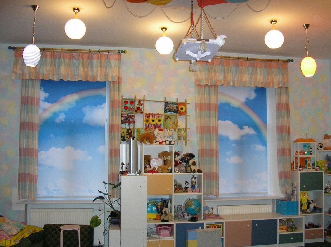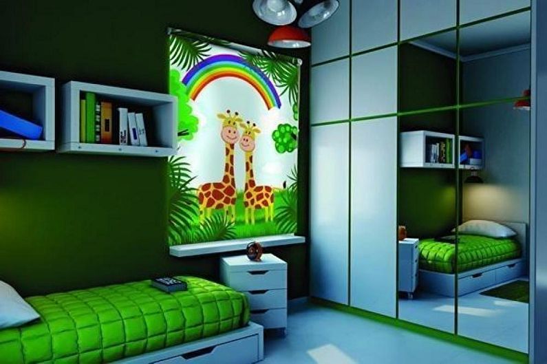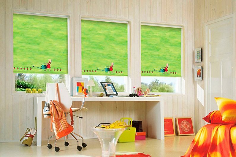 في غرفة الطفل ، تم تصميم التصميم لخلق مزاج خفيف وهادئ. لذلك ، فإن الحل الأكثر نجاحًا هو استخدام الستائر التي تُطبق عليها صورة شخصية كرتونية أو حكاية خرافية مفضلة ، أو حيوان ، بالإضافة إلى مطبوعات ساطعة بدرجة كافية أو ، بالنسبة لفتاة ، زهور دقيقة. تبدو طباعة الصور جيدة.