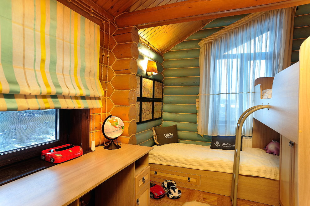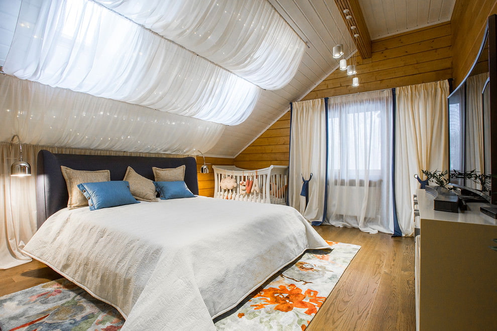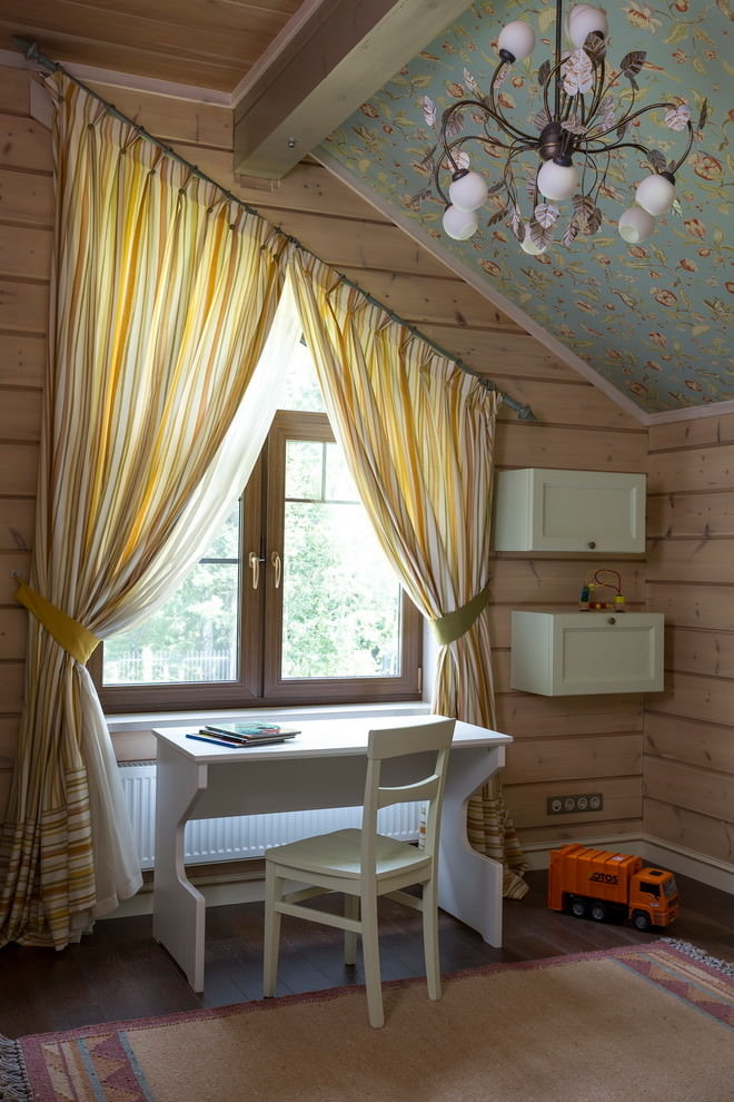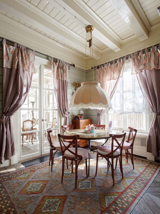 حسنا ، عندما الستائر لإعطاء علاقة مع الموسم. إذا كان الكوخ على مدار السنة ، في فصل الشتاء ، تحتاج إلى تعليق ستائر من المواد الثقيلة الكثيفة - فهي ستساعد في الحفاظ على درجة حرارة مريحة في الغرفة.