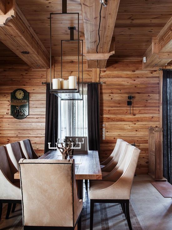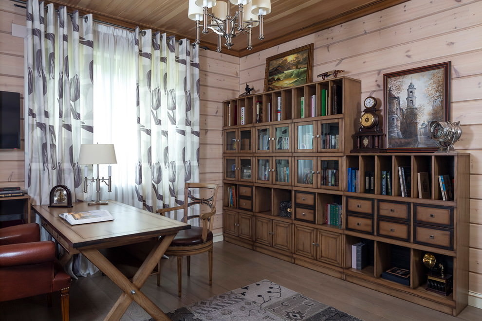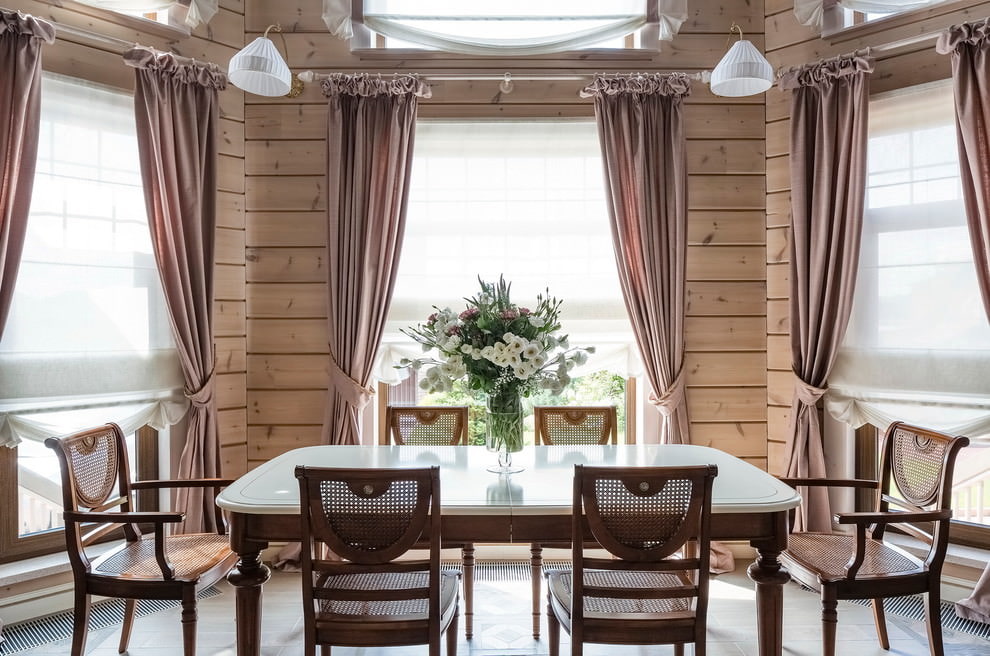 يمكن صنع الكلاسيكيات في منزل خشبي ، إذا التقطت ستائر ثقيلة ثقيلة.