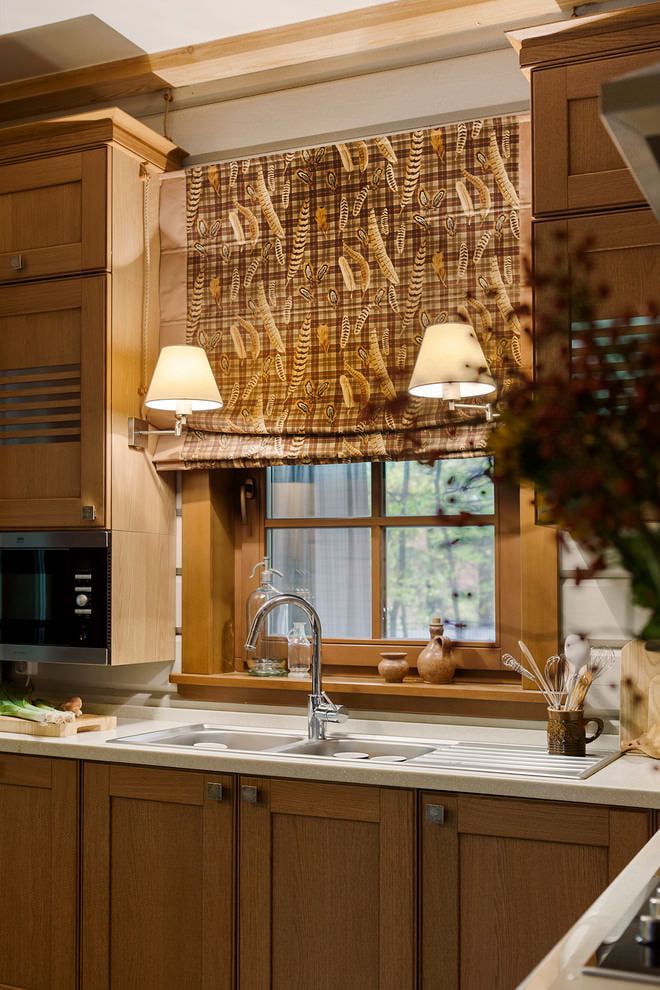 طول الستائر الريفية عادة ما يكون صغيرًا ، لأنه يمكن استخدام عتبة النافذة الخشبية الواسعة لأغراض وظيفية - كسطح عمل أو رف.