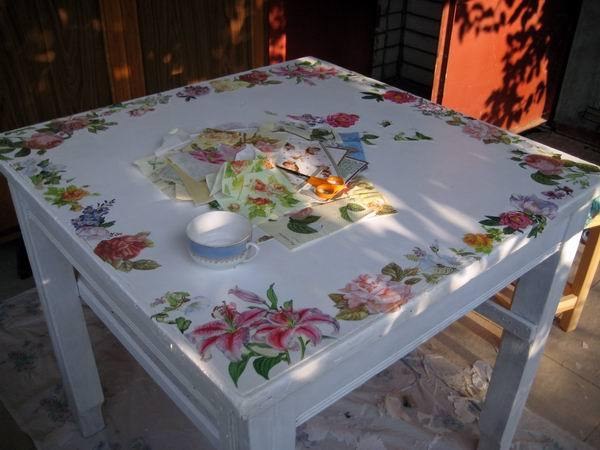 لن يسمح Decoupage فقط بالميزانية وبسرعة بتحويل الجدول ، بل سيسهل ذلك أيضًا ، على سبيل المثال ، في إطار الشابي الأنيق