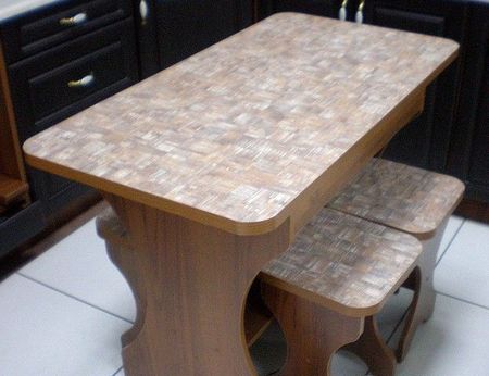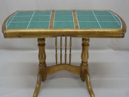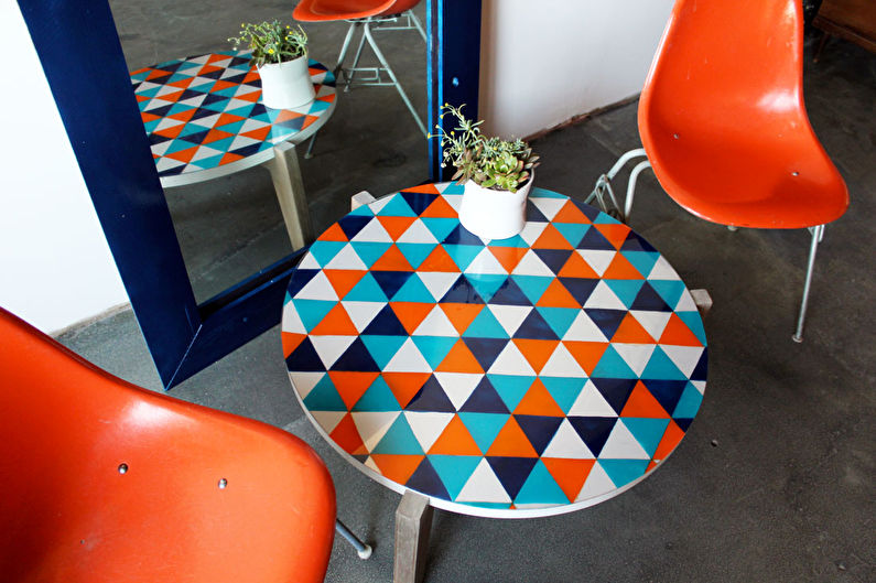 الأسلوب الأصلي في استعادة الأثاث هو وضع البلاط على سطح الطاولة. تسمح هذه الطريقة للمنتج بالحفاظ على مظهر جميل لفترة طويلة ، لأنه لن يخاف من آثار الرطوبة ودرجات الحرارة المرتفعة.