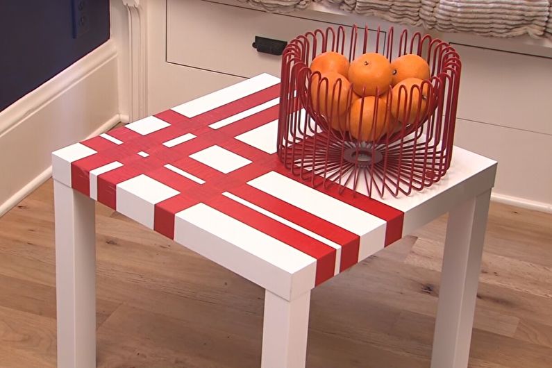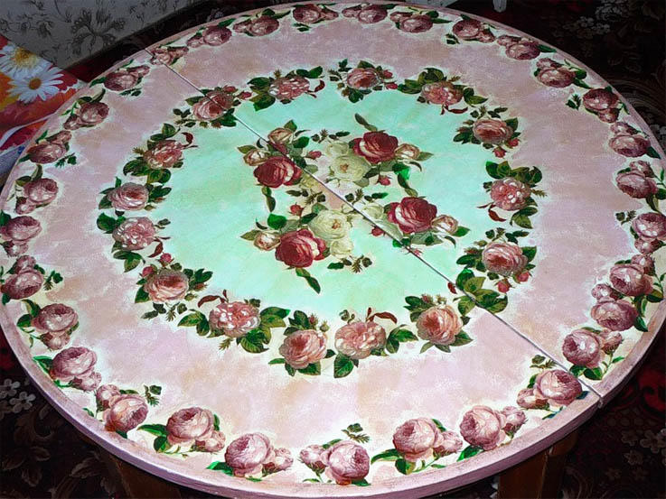 المرحلة الأخيرة من ترميم الطاولة الخشبية مزخرفة. يمكنك مرة أخرى أن تأخذ الفرشاة ، وباستخدام مختلف الإستنسل أو شريط التقنيع ، قم بتطبيق التطبيق على سطح الطاولة.