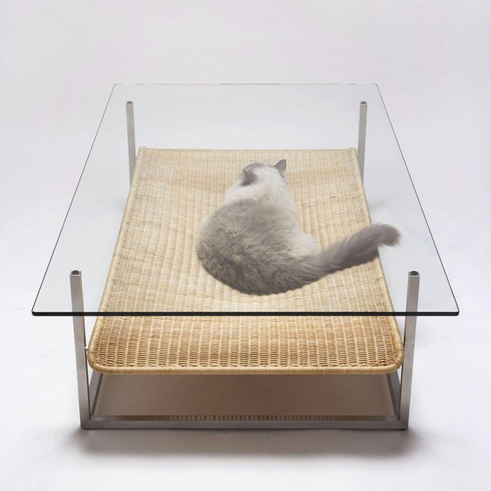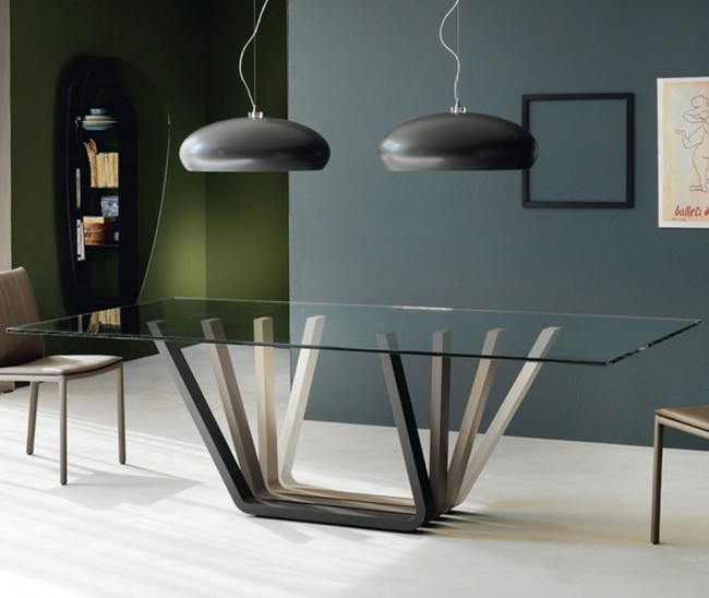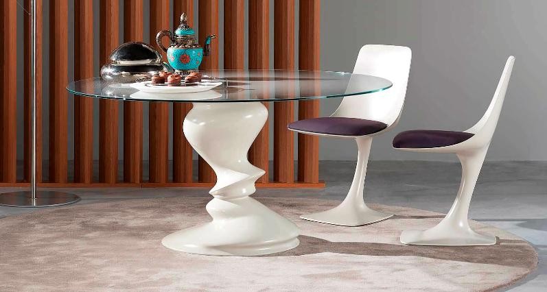 قاعدة طاولة المصمم مصنوعة من البوليمرات والخشب ، ويصنع سطح الطاولة من الزجاج المقسى.