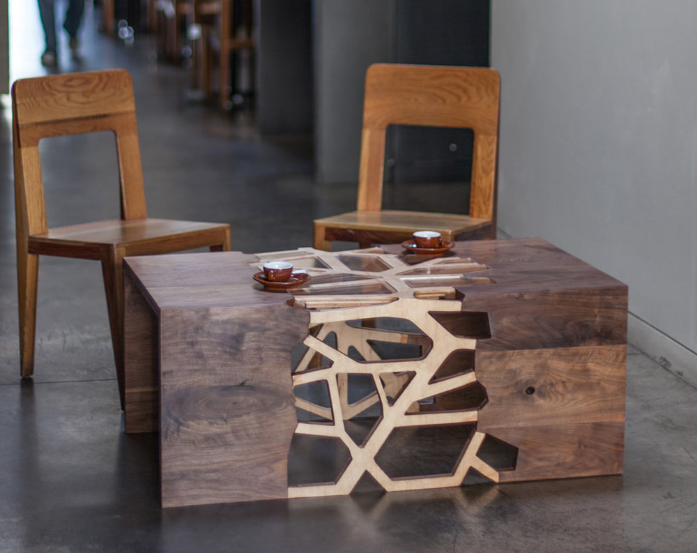 لا حاجة إلى الخروج بتصميم ، لأن الشجرة لديها نسيجها الفريد الخاص بها. ما الجداول لا تفعل ، فهي تختلف في الشكل والحجم ، مثل هذا الجدول يعتبر عملا فنيا.