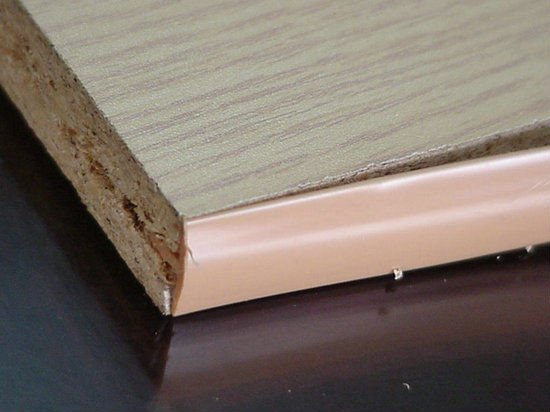 - لصق شريط الميلامين. يعمل الغراء المطبق على الشريط نفسه على تبسيط العملية ، لكن الحافة الناتجة تخاف من الرطوبة وغير مستقرة في الضغط الميكانيكي.