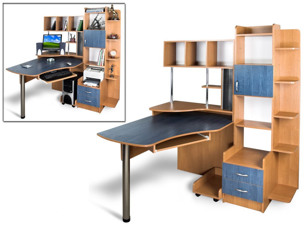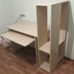 بادئ ذي بدء ، فإن تناغم التصميم مع الأثاث في الغرفة أمر مهم. يمكنك اختيار الخيارات على الإنترنت ، ولكن عليك أن تأخذ في الاعتبار حجم المساحة المخصصة للجدول. يجب اختيار التصميم على أساس وظائف الجدول. إذا كنت بحاجة إلى مكتب كمبيوتر لجهاز كمبيوتر ثابت ، فستكون هناك حاجة لوجود رف لوحة المفاتيح ومساحة للشاشة لوحدة النظام. إذا كان الجدول مصممًا للعمل مع كمبيوتر محمول ، فيمكنك إنشاء أرفف إضافية بدلاً من المنافذ التي سيتم تخزين الأشياء بها.