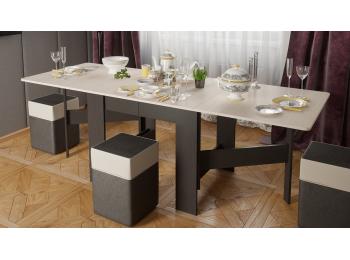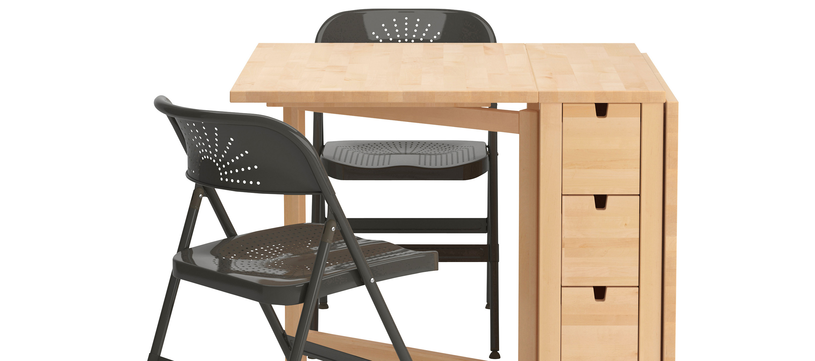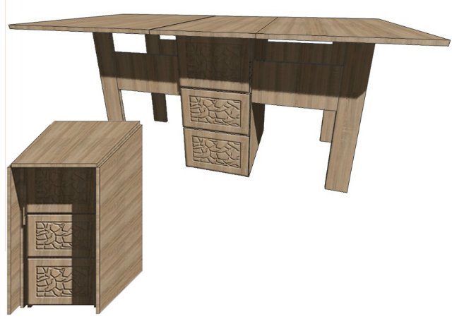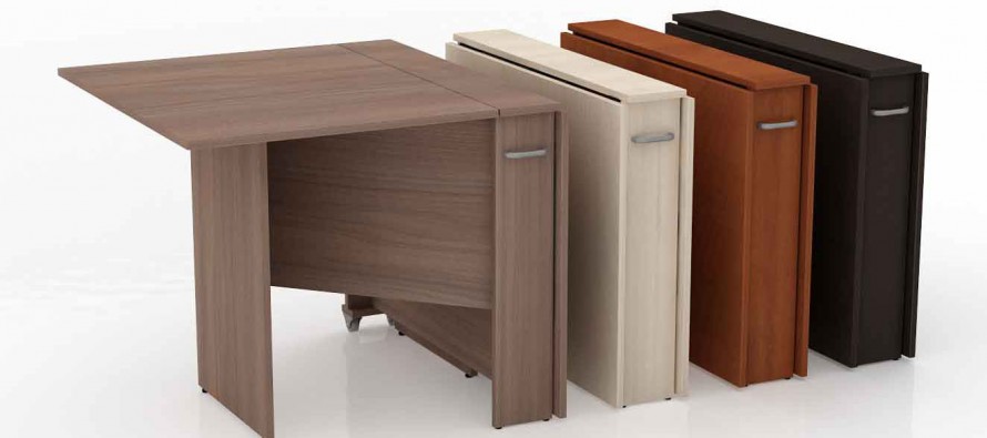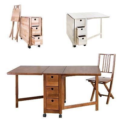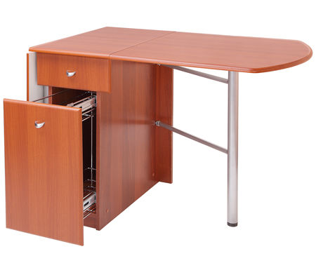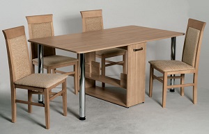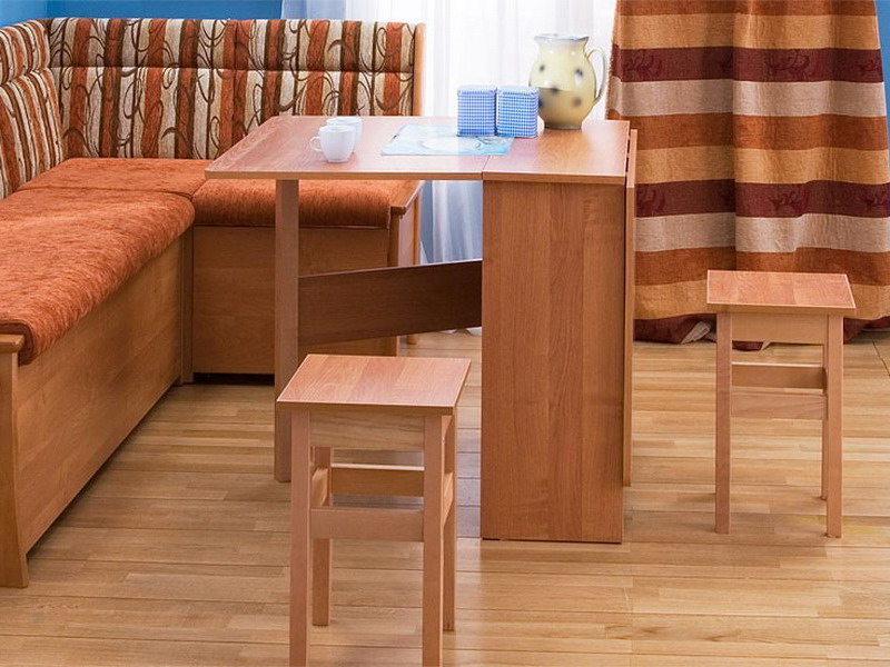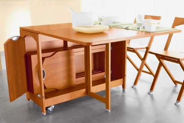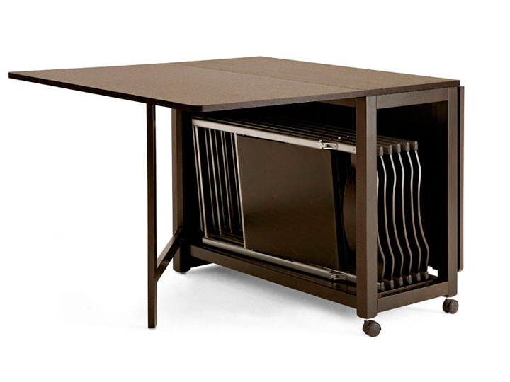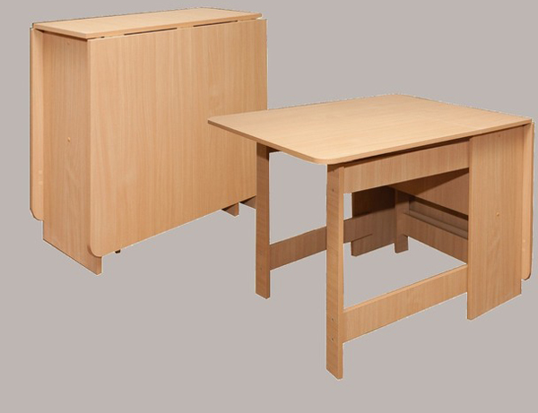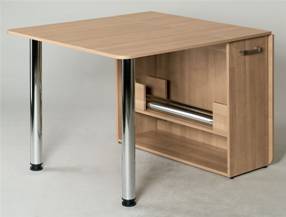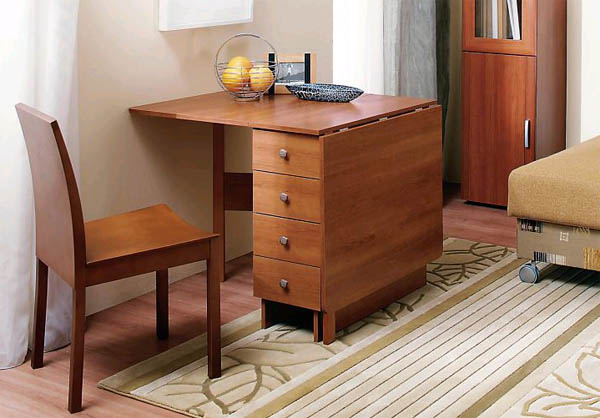 - طاولات مع كراسي قابلة للطي مختبئة أسفل سطح الطاولة. هذه المجموعة هي الحل الأمثل لشقة الاستوديو. تشبه عناصر الأثاث الأكثر تعقيدًا استهلاكًا أكبر للمواد أثناء إنشائها ومهارات معينة بالإضافة إلى مساحة أكبر من الغرفة.