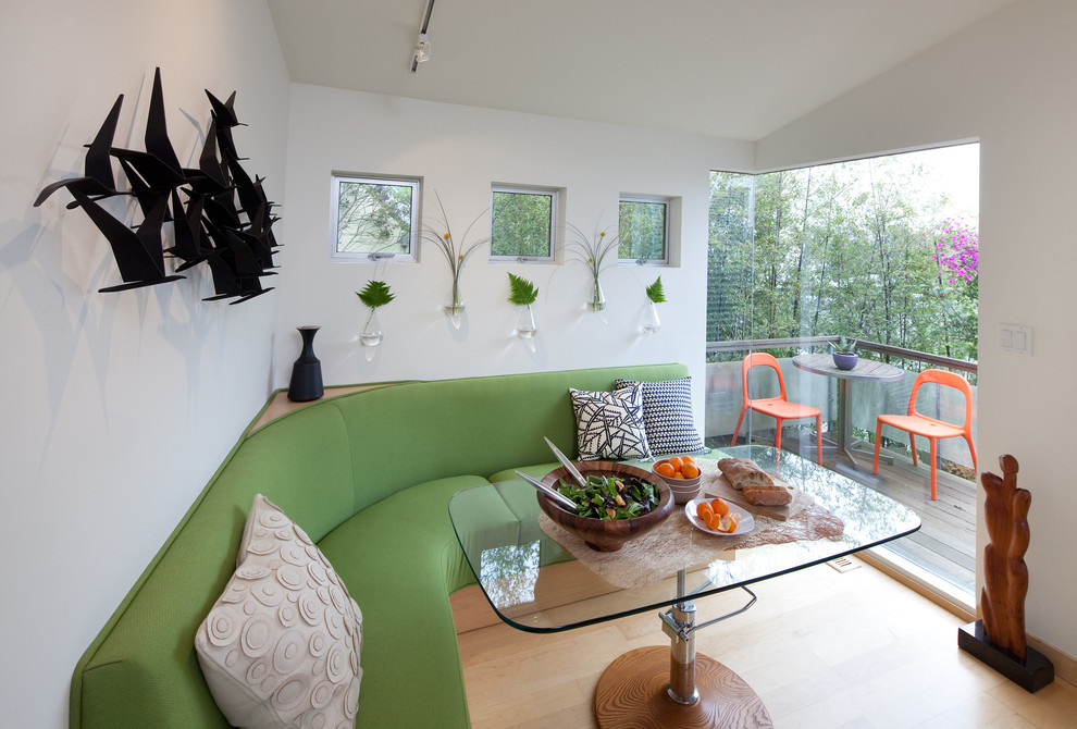 ولكن لا يمكن بأي حال وضع طاولة زجاجية ، لأنها ستفقد دورها الرئيسي تمامًا - الشفافية وانعدام الوزن.