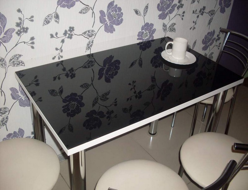 أسهل طريقة لتزيين سطح الطاولة هي ربط فيلم لاصق خاص بنقوش مختلفة على الجزء السفلي منه. بالنسبة للأشخاص المبدعين ، يتمثل الحل الأمثل في استخدام تقنية الزجاج الملون ، والذي يسمح لك بتطبيق الصورة المطلوبة على السطح باستخدام الإستنسل والدهانات.
