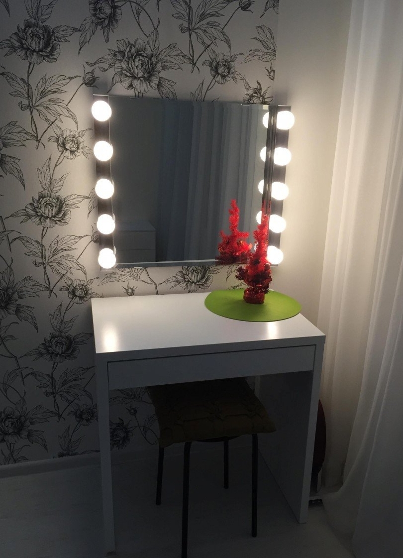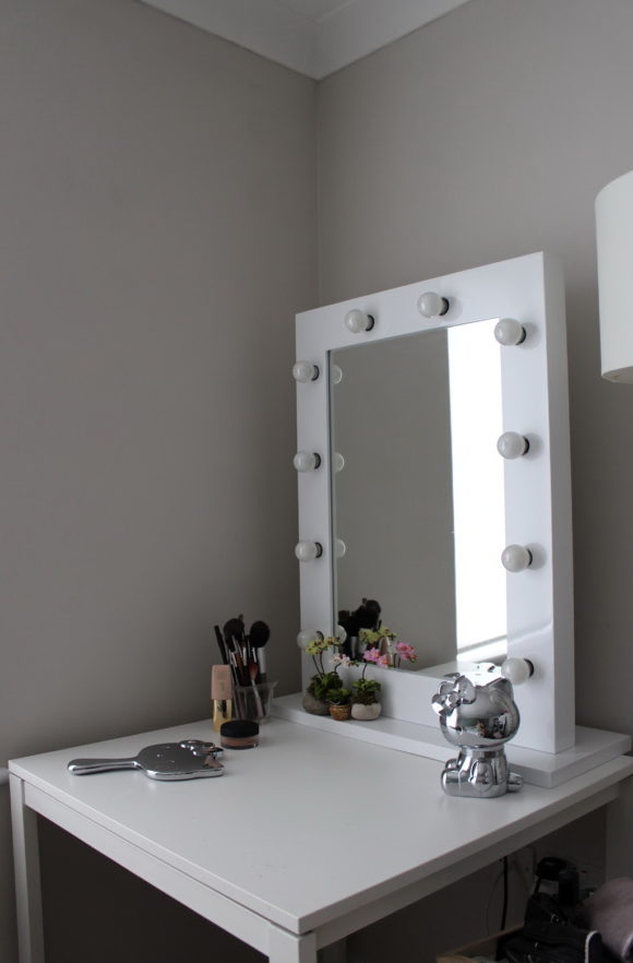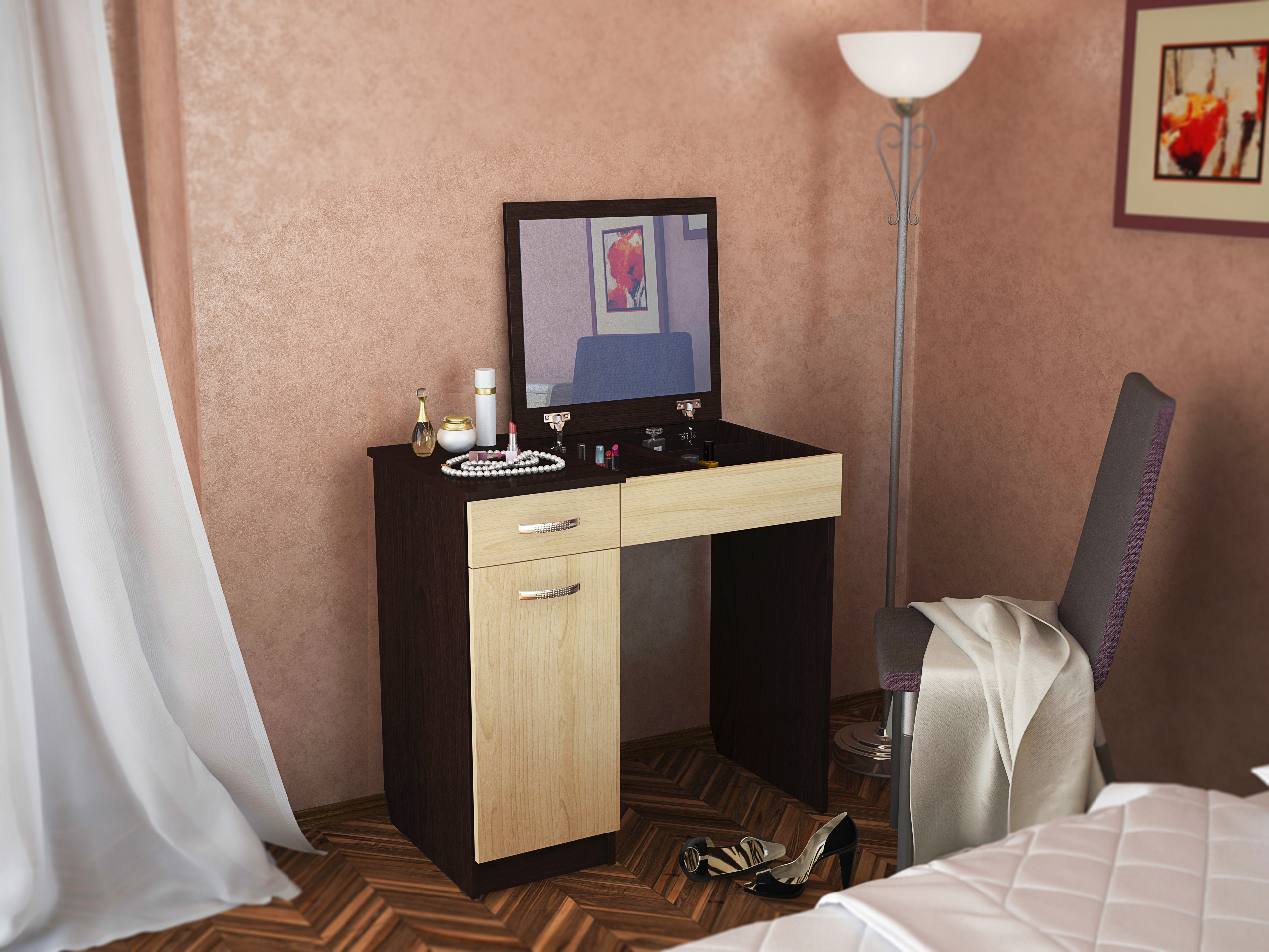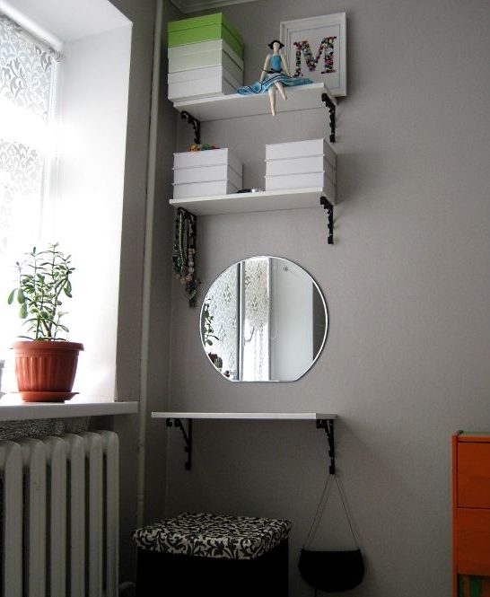منضدة الزينة الأنيقة مع مرآة منفصلة على الحائط.