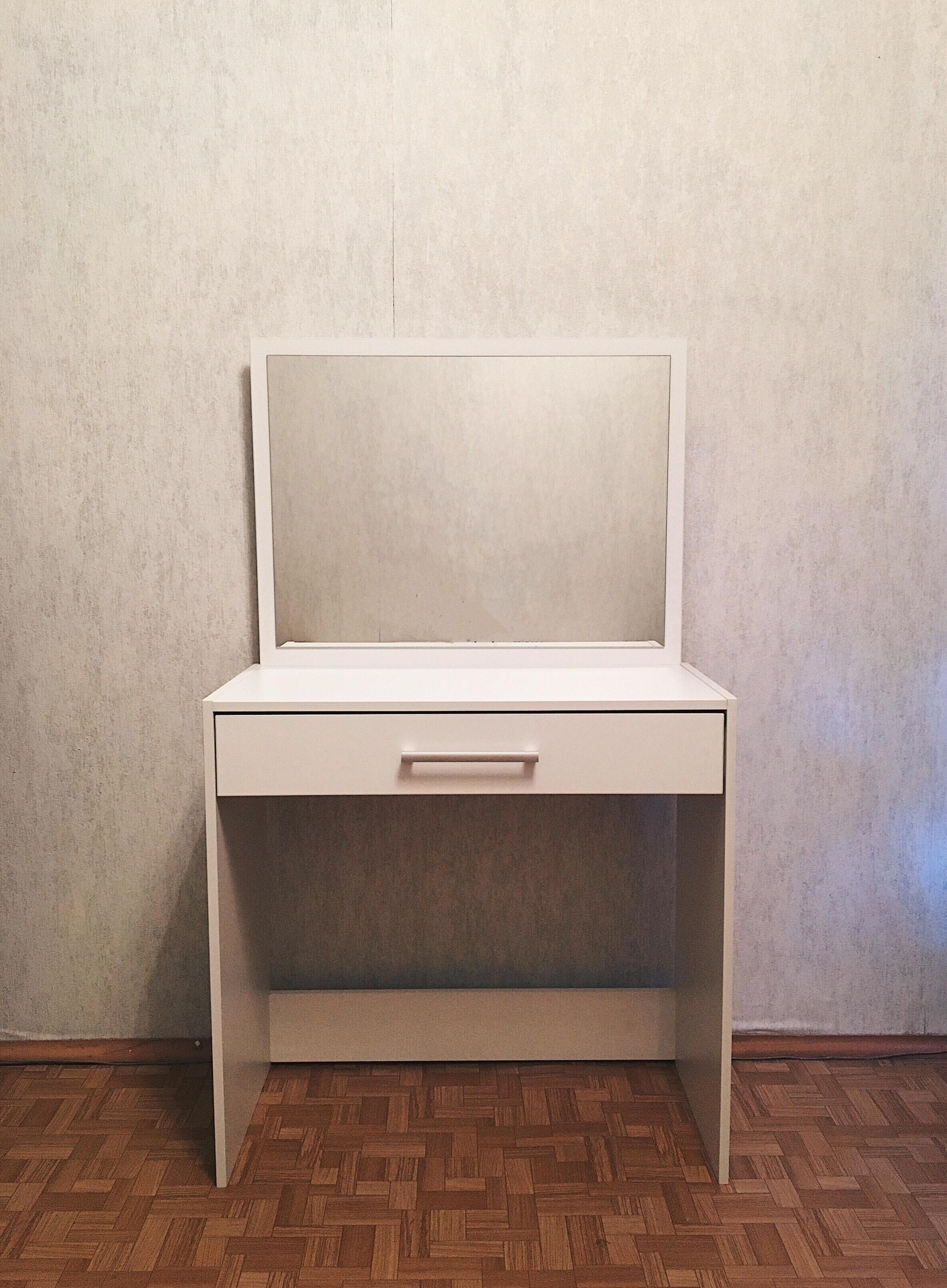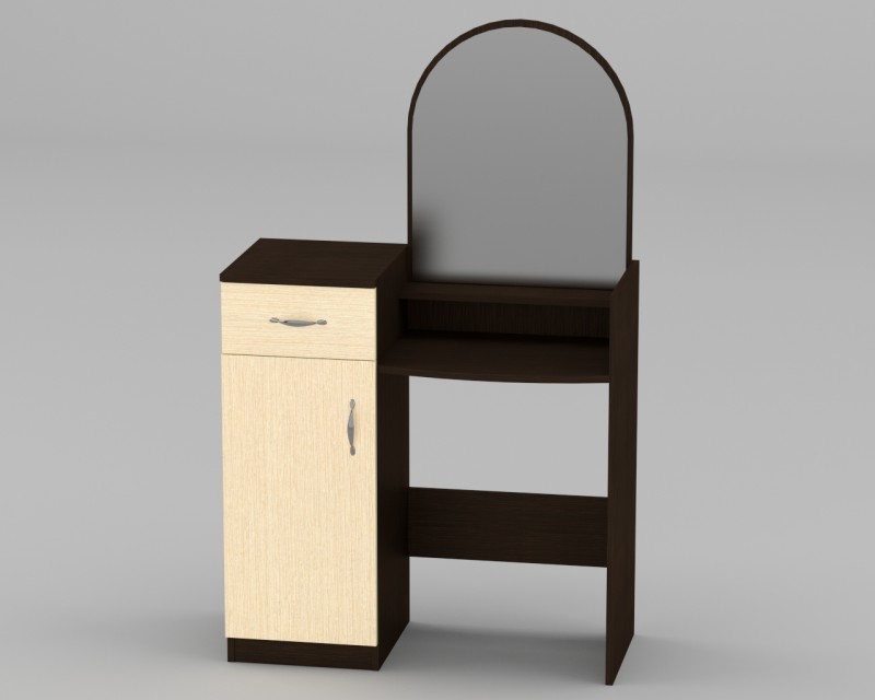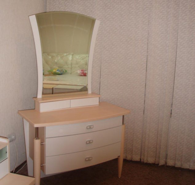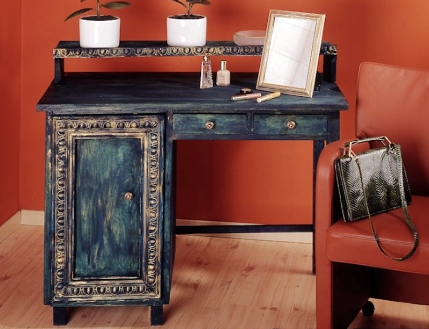 طاولة من تصميم معقد مع أدراج ، مرايا ، طاولات جانبية ، أسطح طاولات بأشكال غير عادية ، أرفف وعناصر أخرى يصعب صنعها من طاولة أنيقة بسيطة على أربع أرجل (المرآة متصلة بالحائط).