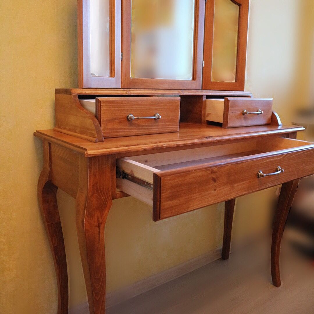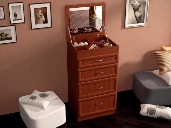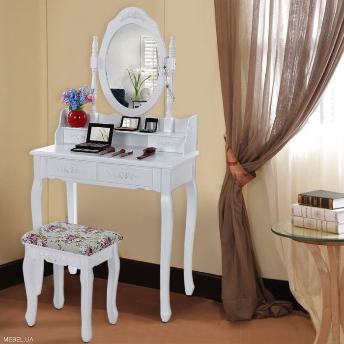 تكتمل طاولة الملابس على الأرجل بأدراج في أسفل سطح الطاولة ، وجهاز لخزانة الكتب على الجانب ، والأدراج المدمجة والجانبية ، والمرايا القابلة للطي ، إلخ. كل عنصر إضافي يعقد التصميم والتصنيع.