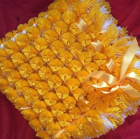 من أجل الحصول على pompom متوسطة الحجم ، نلف الخيط حول الذراع 55-60 مرة.