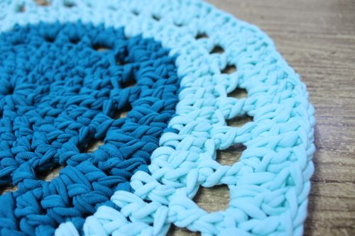 للحصول على بساط من القمصان الكروشيه القديمة ، يمكنك استخدام أي نمط ، على سبيل المثال ، نمط مماثل للمناديل.