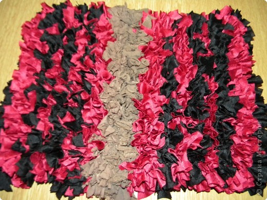 وضعت على شرائط من القماش وضعت على القاعدة ومخيط على آلة كاتبة. بعد ذلك ، تقصير الشريط مقص إلى الطول المطلوب. نتيجة لذلك ، يمكنك الحصول على سجادة رقيق.