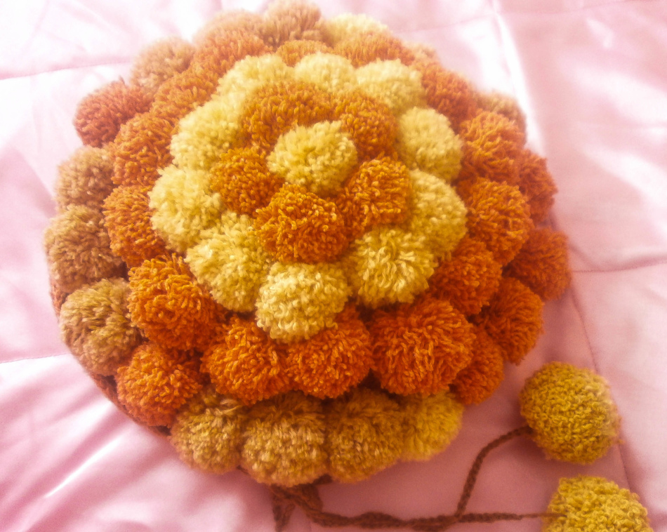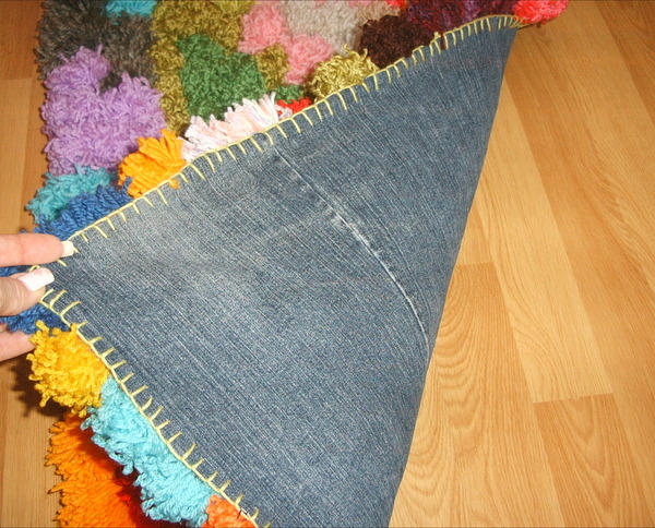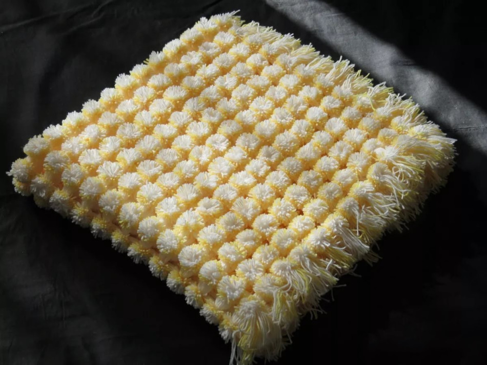 خياطة بإحكام الكرات على القاعدة. من الجانب القاسي ، قم بتطبيق القماش لإخفاء العقد والخيوط على عباءة. ليس من الضروري ضغط المنتج ، فلا ينبغي أن يكون سميكًا ، حتى لا يفقد مرونته ويتناسب تمامًا مع الأثاث. يمكن أن تكون حواف العمل لزجة أو نسج شريطًا من اختيارك.