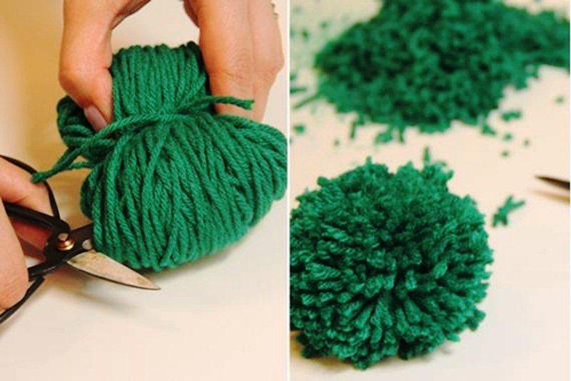 خذ المقص والخيط والشوكة. لف الخيط على القابس ، وترك الحواف خالية. خذ حواف الغزل وربطها بإحكام في المنتصف. قطع الحلقات من الخيوط ، والتي تشكلت من الجانبين ، مع مقص. نشر الكرة.