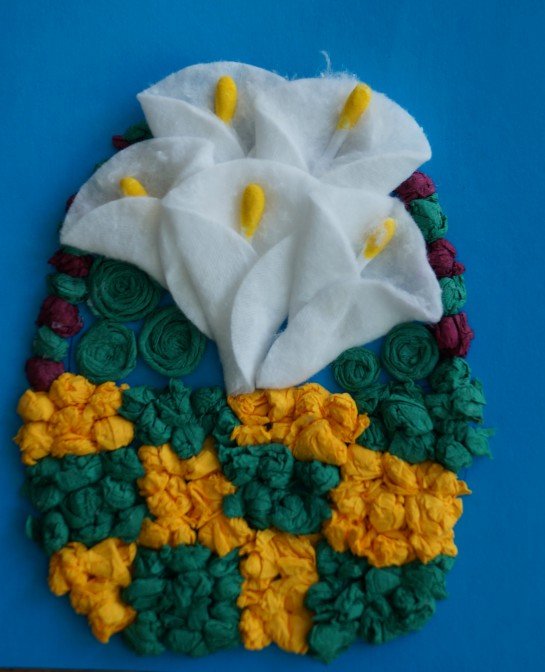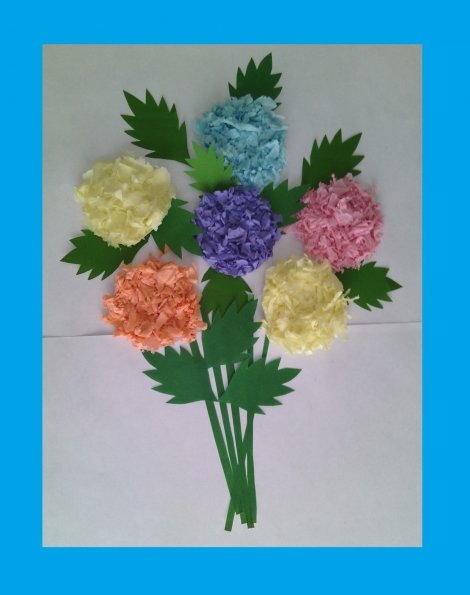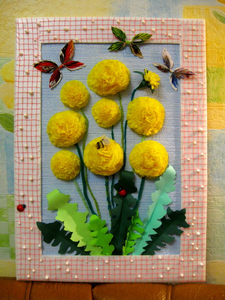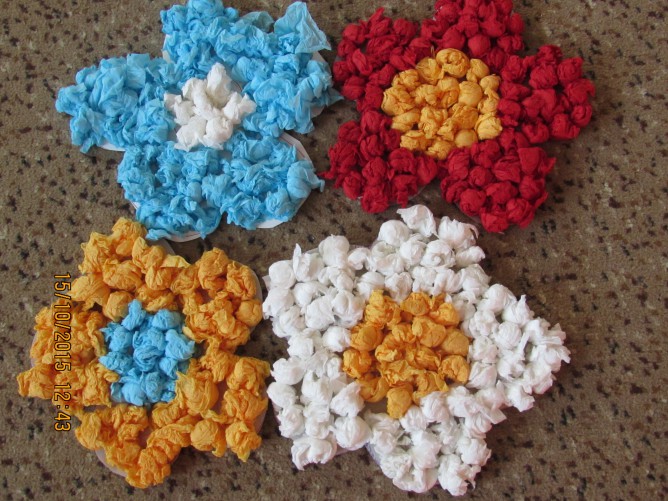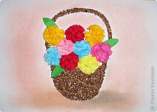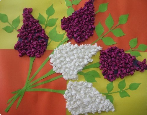 الفراغات مصنوعة ببساطة: من المنديل كله تحتاج إلى تمزيق القطع الصغيرة بأصابعك ولف كرة بها. ثم يتم لصقها على الرسم. لأداء العمل الذي يستخدم في كثير من الأحيان ورقة متعددة الألوان.