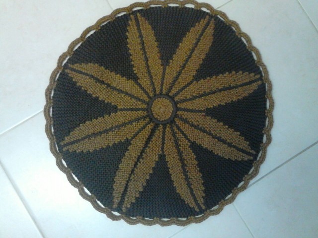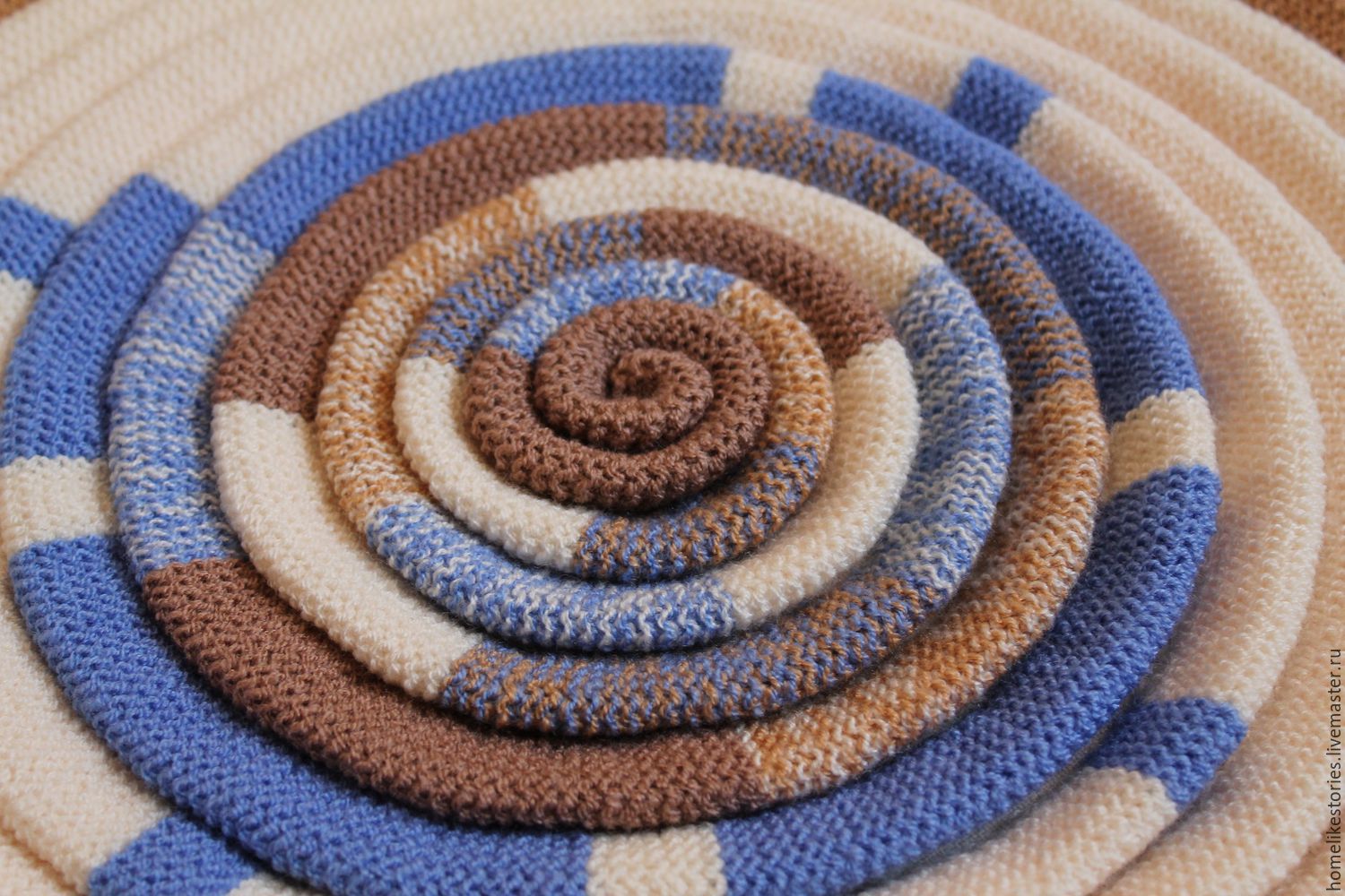 - الجولة. الحياكة تبدأ من المركز وتستمر في دوامة. وبهذه الطريقة ، يمكنك إنشاء مسار على الأرض من أي حجم. الشيء الرئيسي هو أن يكون لديك ما يكفي من المواضيع ووضعها على الإبر.