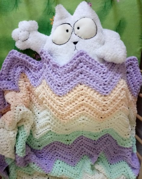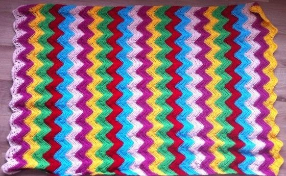 نمط "متعرج" تحظى بشعبية كبيرة بين سادة البداية. يمكن أن يكون القماش سميكًا ، دافئًا في أمسيات الشتاء ، مع استمرار العمل اليدوي ، مما يوفر الراحة للمنزل. هذا الغطاء مناسب تمامًا لطفل صغير في عربة أطفال ، وسيظهر جيدًا أيضًا على الأريكة.