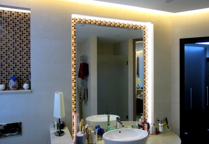 سيتم تطبيق الإضاءة الخلفية على طول محيط المرآة إما في صندوق خاص أو ببساطة على شريط لاصق. إذا كانت المرآة ذات شكل هندسي معقد مع انحناءات وانحناءات ، فسيكون تثبيت الصندوق أمرًا صعبًا ، لذلك سيكون من الأسهل تقييد الشريط ، والذي من الأفضل الصمغ خلف المرآة ، مما يوفر توهجًا مخفيًا لطيفًا.