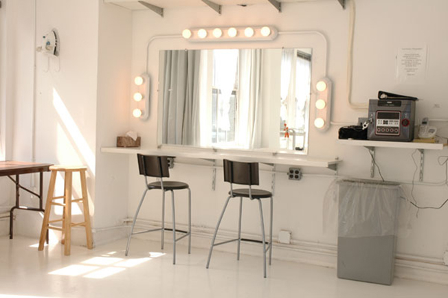 ضيقة غرفة خلع الملابس مع إضاءة جيدة في المرآة