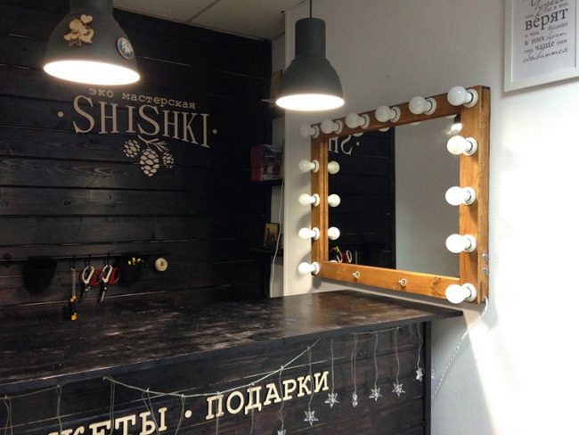 واحدة من الخيارات السهلة للحصول على مرآة مع المصابيح هي ديكور أكاليل كبيرة.