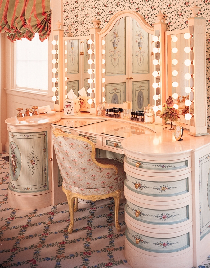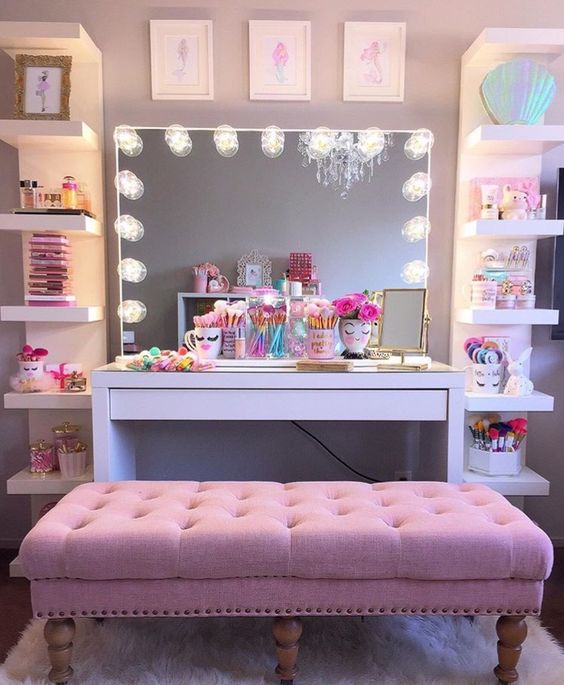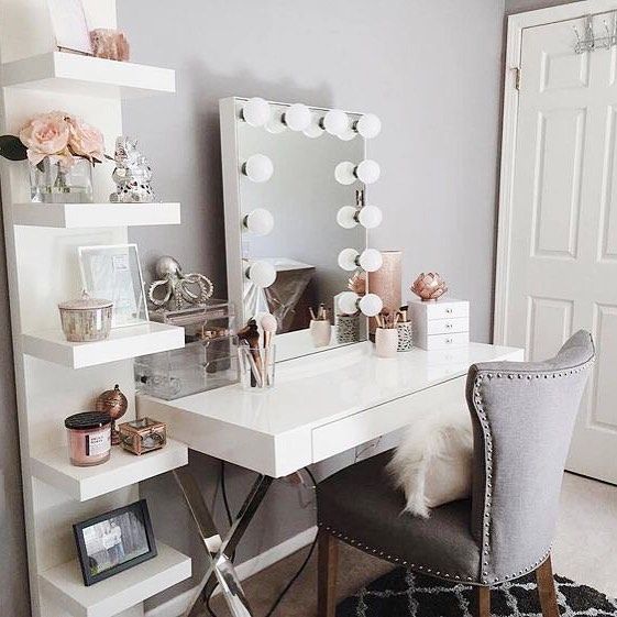 ركن السيدة مع طاولة صغيرة للملابس ومرآة للماكياج