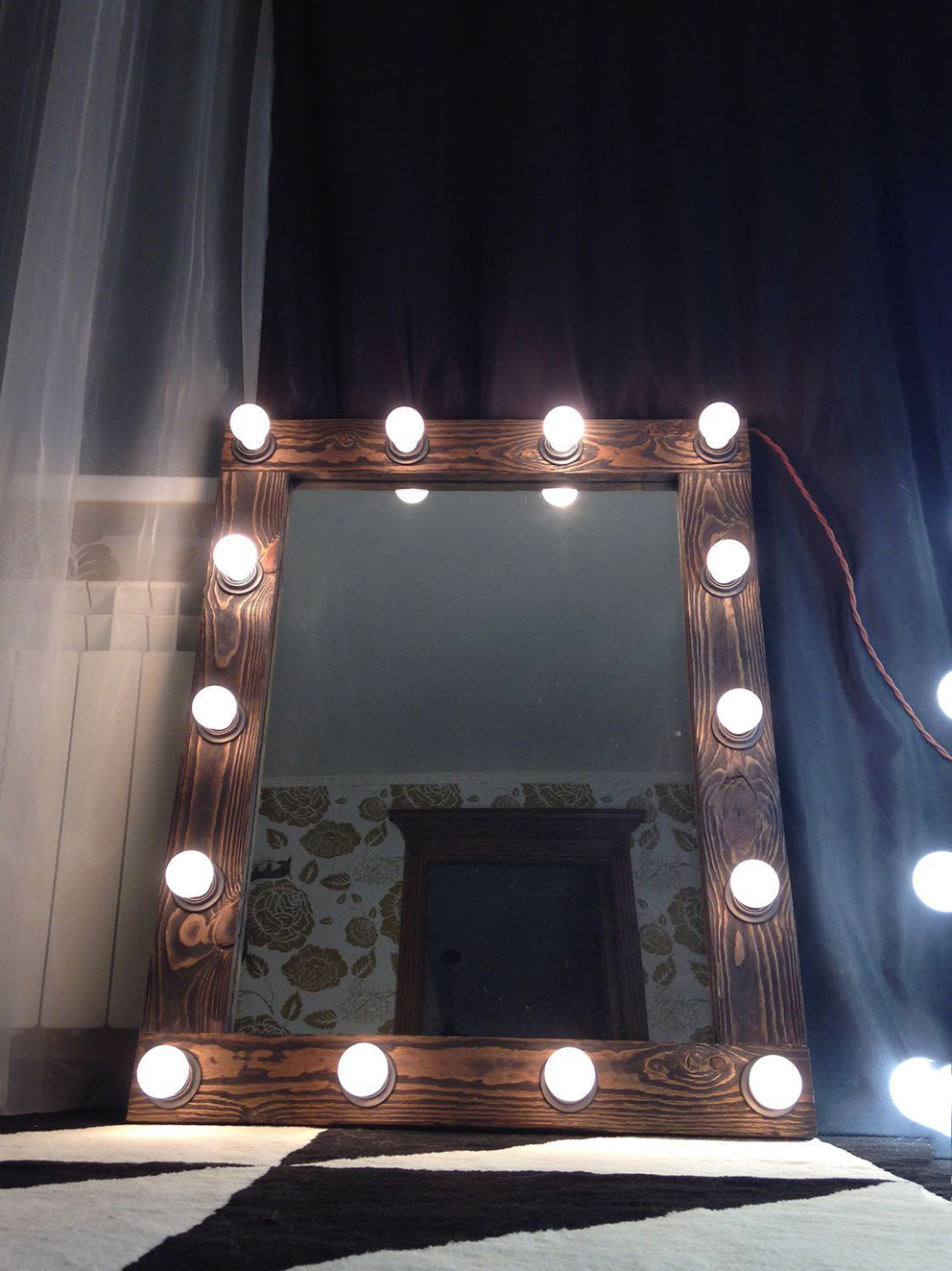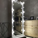 مرآة مستطيلة أنيقة في الأرضية مع إضاءة في إطار خشبي ، صنعت بنفسك