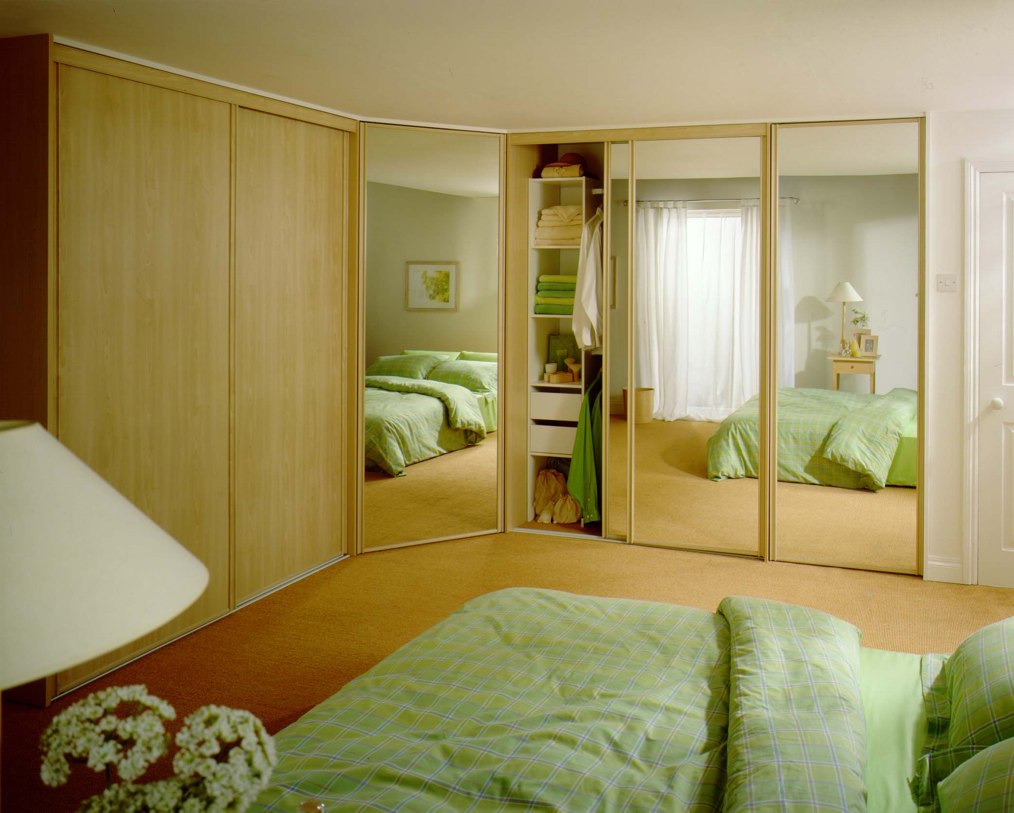 أفضل حل للتصميم سيكون مرآة في غرفة النوم في شكل خزانة الملابس. لا يبدو سطح المرآة في ملف تعريف الباب أقل غرابة ، في حين يتم استهلاك المنطقة المفيدة اقتصاديًا وتتسع الغرفة بصريًا.