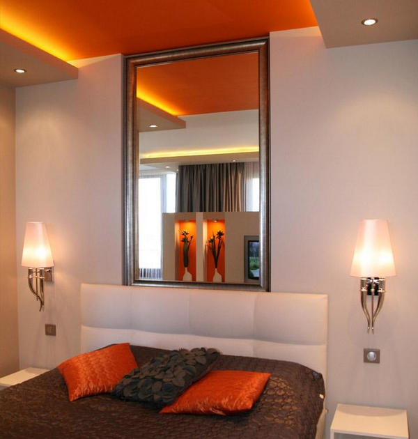 يمكن للمرآة الموجودة أمام السرير ، والتي تتحدث باعتبارها عنصرًا مهمًا من عناصر الديكور ، أن تعزز الانطباع وتعطي سطوعًا أكبر لجميع كائنات غرفة النوم ، بما في ذلك السقف والجدران. تعتبر الأسطح المرآة في هذا الصدد مثالية لعشاق التصميم الأنيق والمريح.